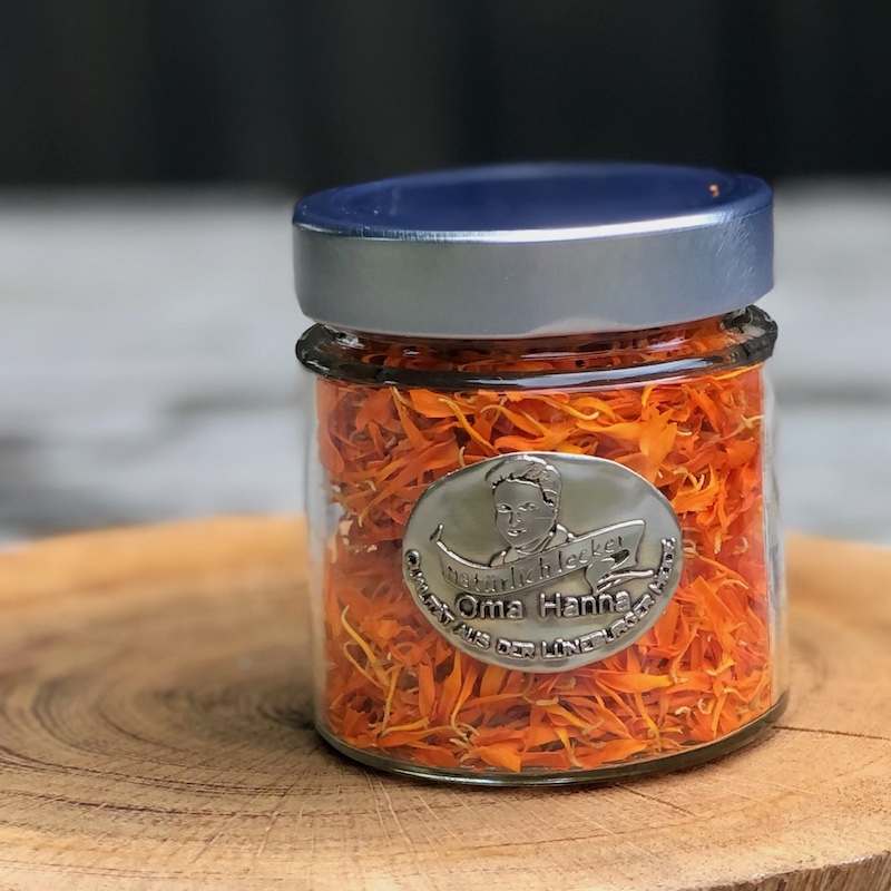 Ringelblumenblütenblätter aus eigenem Anbau, getrocknet